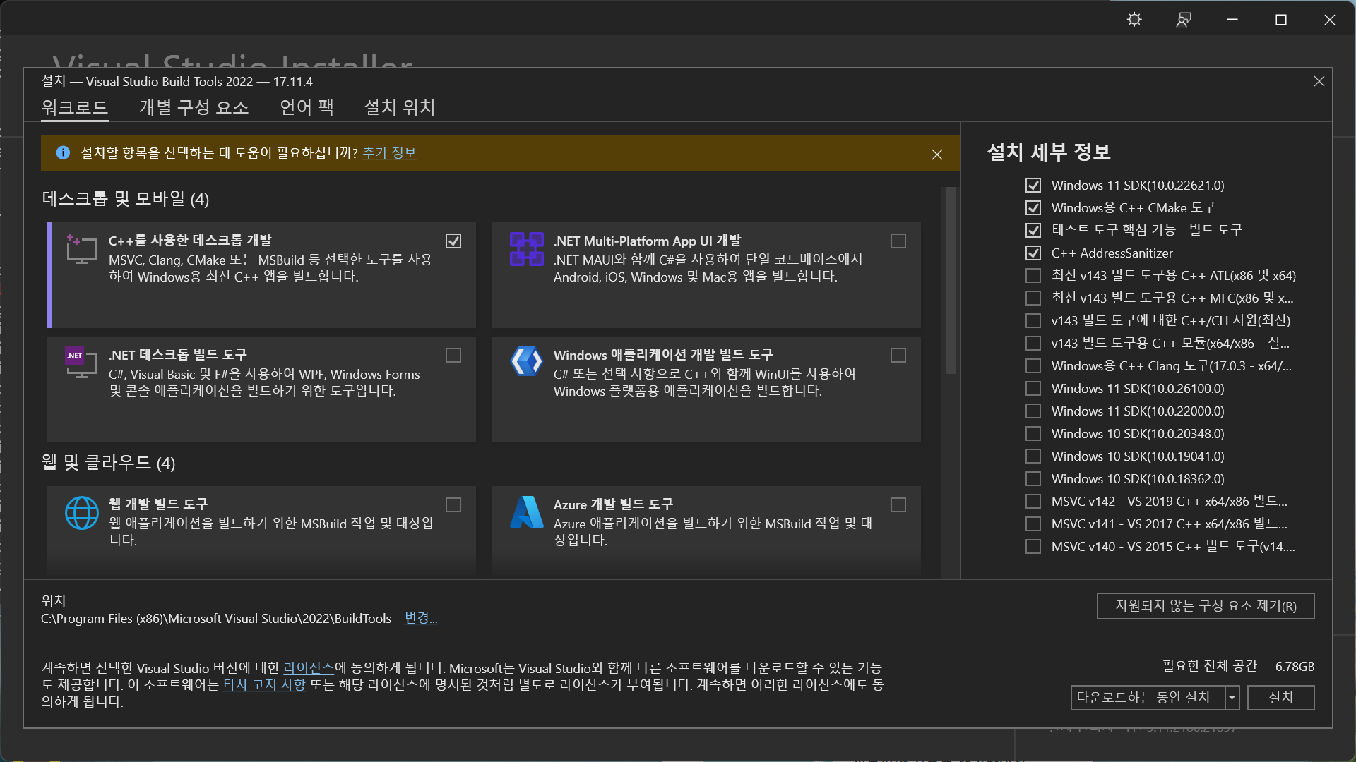 - 설치 시, "C++ Build Tools" 옵션을 선택하고, 필요한 C++ 컴파일러와 라이브러리 패키지를 포함해야 한다.