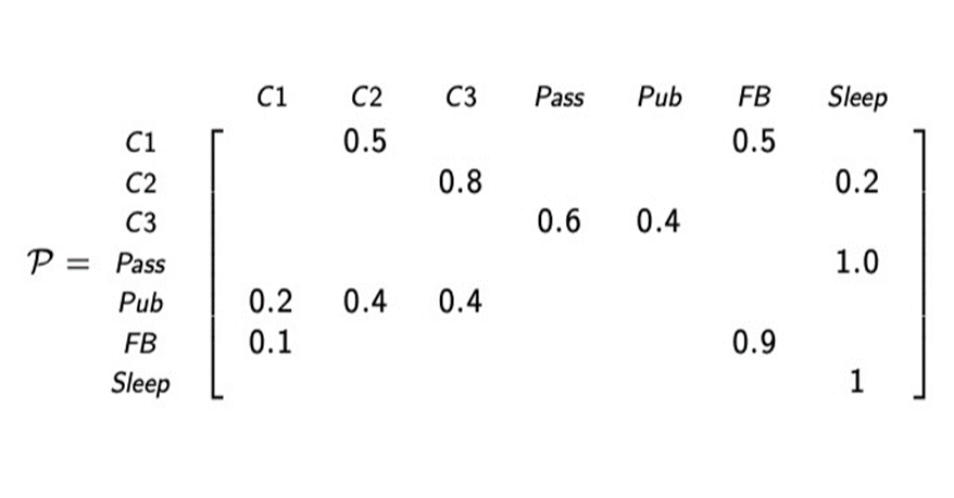 Class 1, Class 2, Class 3, Facebook, Pub, Pass, Sleep 라는 state가 있고 각 state로의 전이 확률이 나타나져 있다.