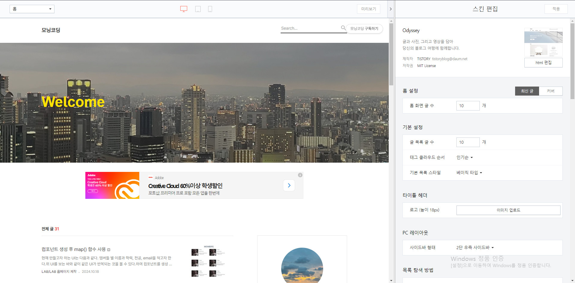 티스토리 수식 입력 방법 1. 아래 코드 복사 여기서 중요한 점은 두 번째 줄에서 { inlineMath: [['$','$'], ['\((','\))']] } 부분에서 쌍 괄호로 되어있는 문자열을 담고 있어야 한다.그렇지 않으면 글에 있는 모든 괄호가 수식으로 인식하게 된다. 2. [블로그 관리] → [스킨 편집] → [html 편집] 위 화면에서 오른쪽 상단의 html 편집을 클릭한다 3. html 코드 헤더 안에 복사한 코드를 추가한다 위 코드 처럼 코드 상단에 태그 내에 위에 복사한 코드를 붙여넣는다.나중에 수정하기 용이하도록 주석 표시로 해당 코드를 설명해놓았다. 과정을 마친 후 적용하기 클릭!!이러면 티스토리 내 설정은 끝난다. 이후 글을 적을 때 수식을 추가할 때의 과정이다. ..